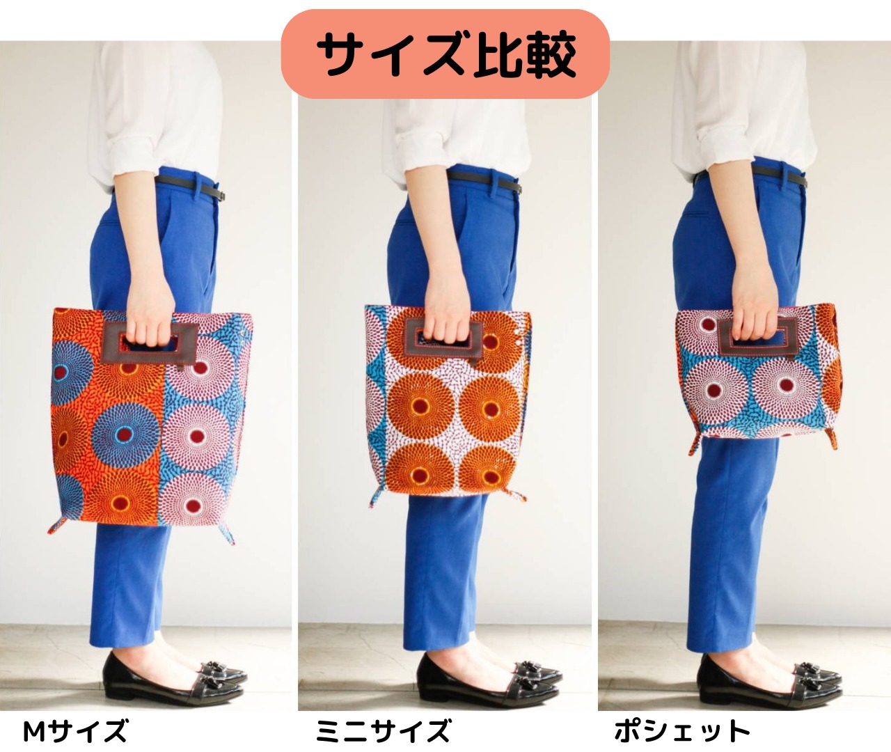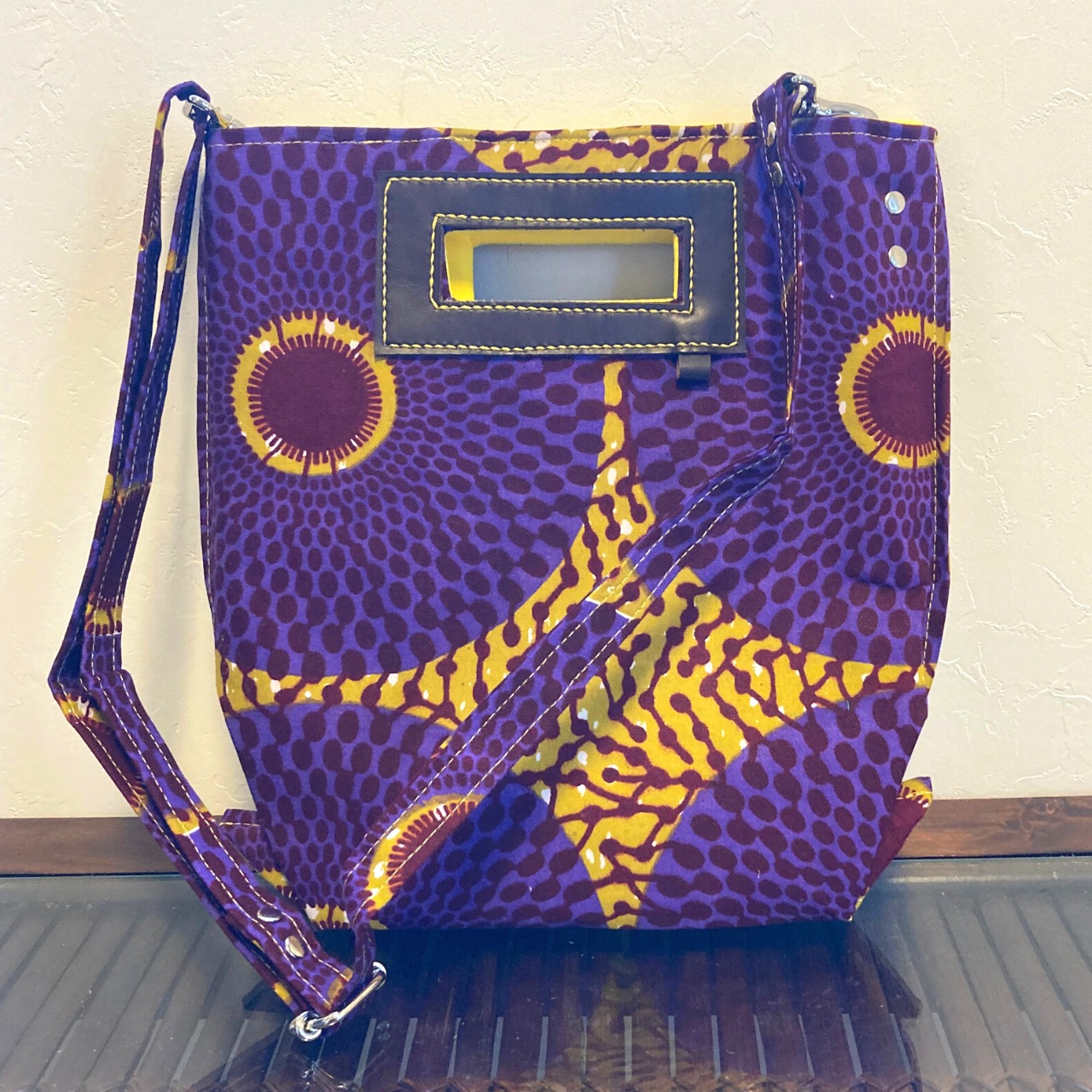 1. アフリカンワックスプリントの布を使用しています。製品製作時に布に水を通し、色止め加工を施す等、極力、水による色落ちを防ぐようにしています。但し極度な水濡れや摩擦等により色落ちする可能性がありますので、雨の日の使用はお控えいただき、十分にご注意下さい。